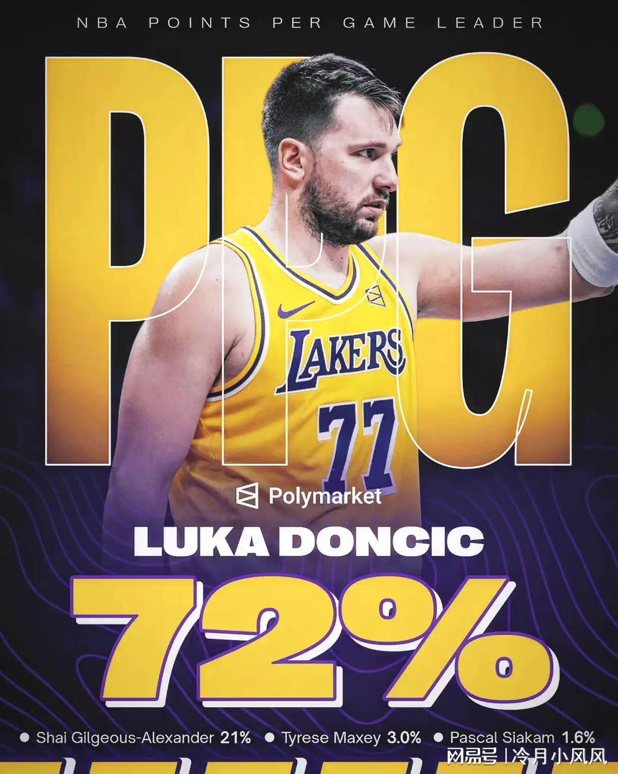 今日,美国媒体《Legion Hoops》根据专业的算法统计出了本赛季球员拿得分王的概率图,结果显示湖人球星卢卡东契奇以72%的概率遥遥领先,亚历山大(21%)、马克西(3%)和西亚卡姆(1.6%)分列2-4位。本赛季至今,东契奇出战32场比赛,场均上场36.4分钟砍下33.6分7.7篮板8.7助攻1.6抢断0.5盖帽,三项命中率46.8%、33.4%和78.3%。